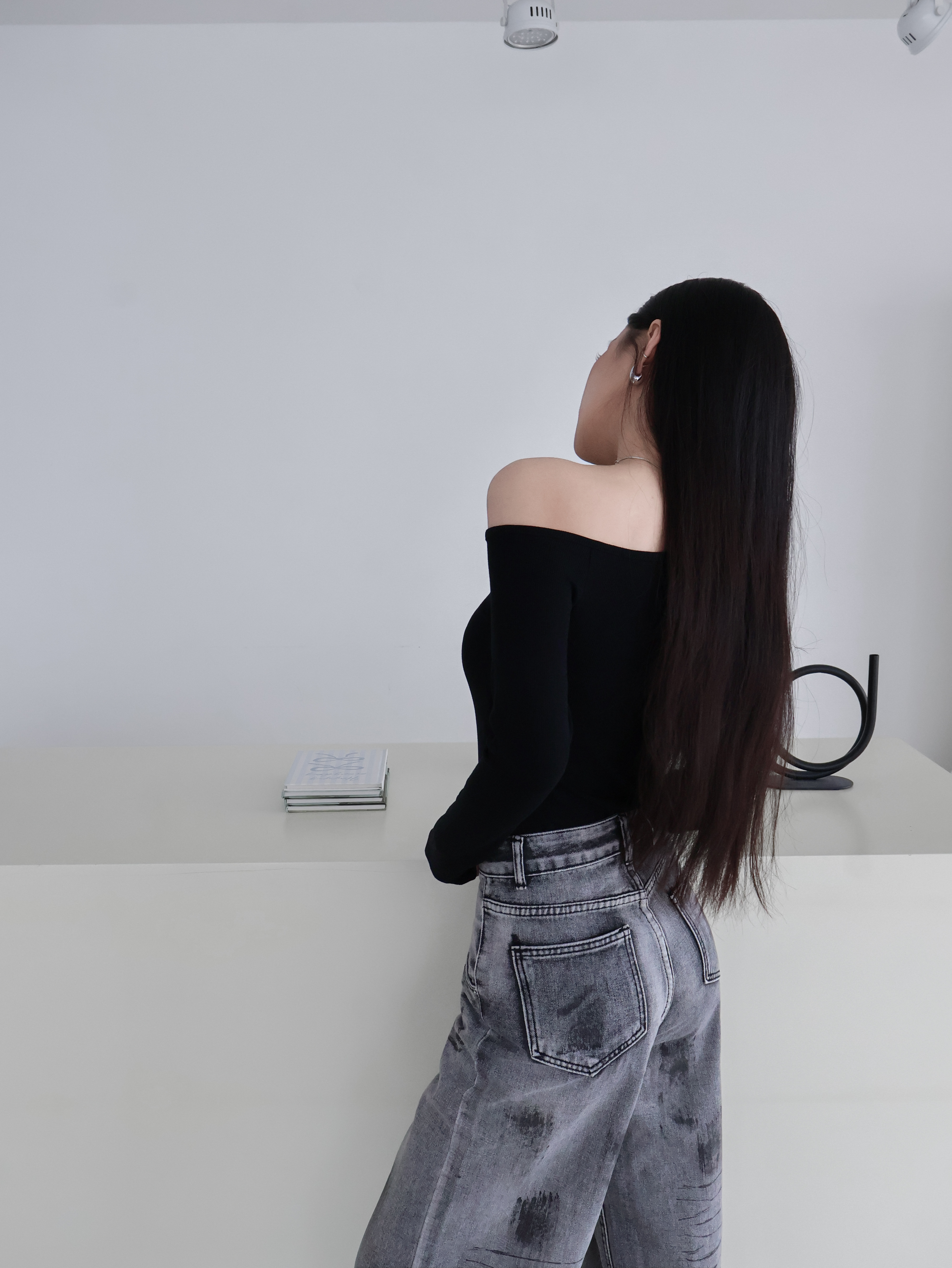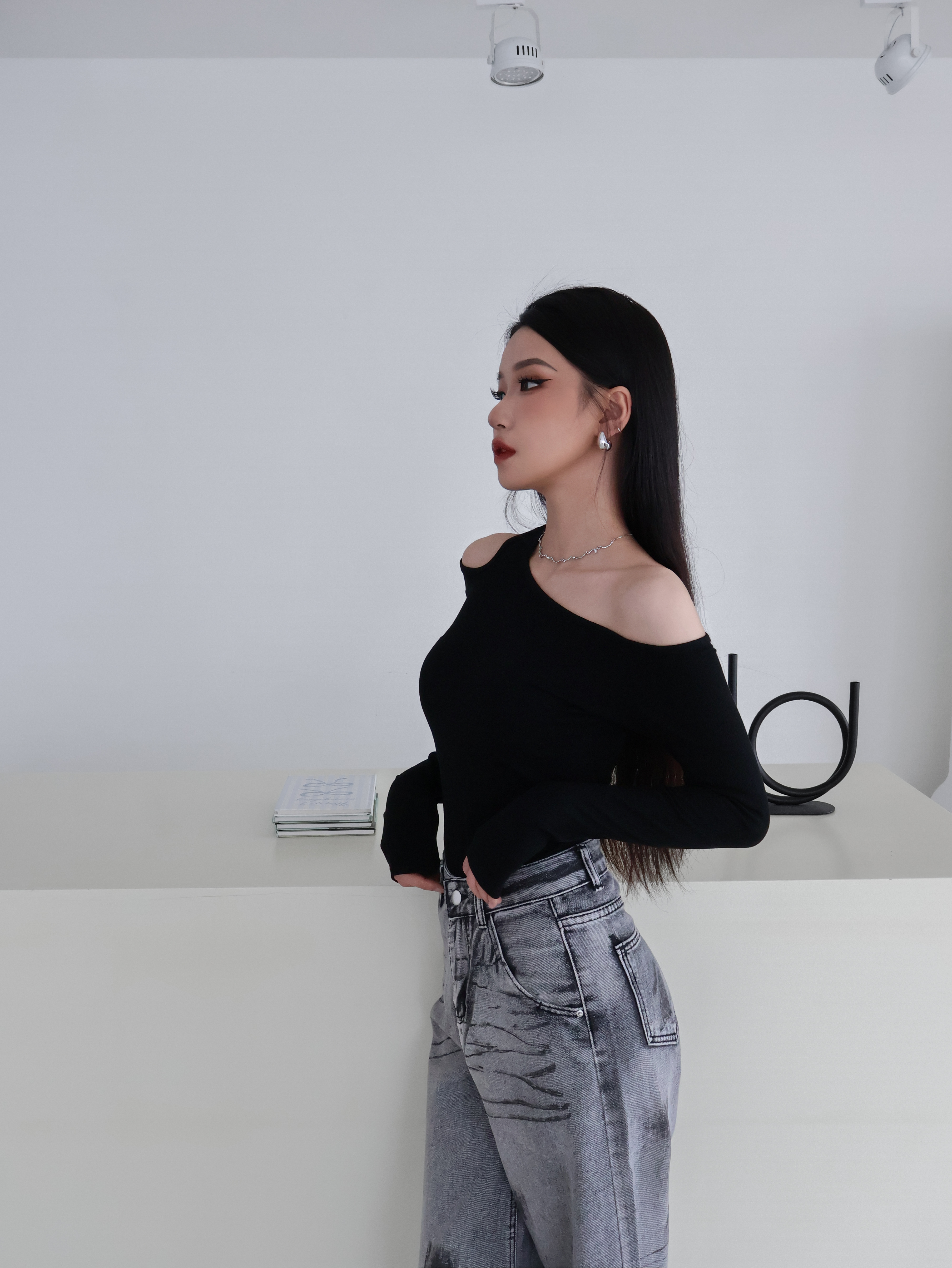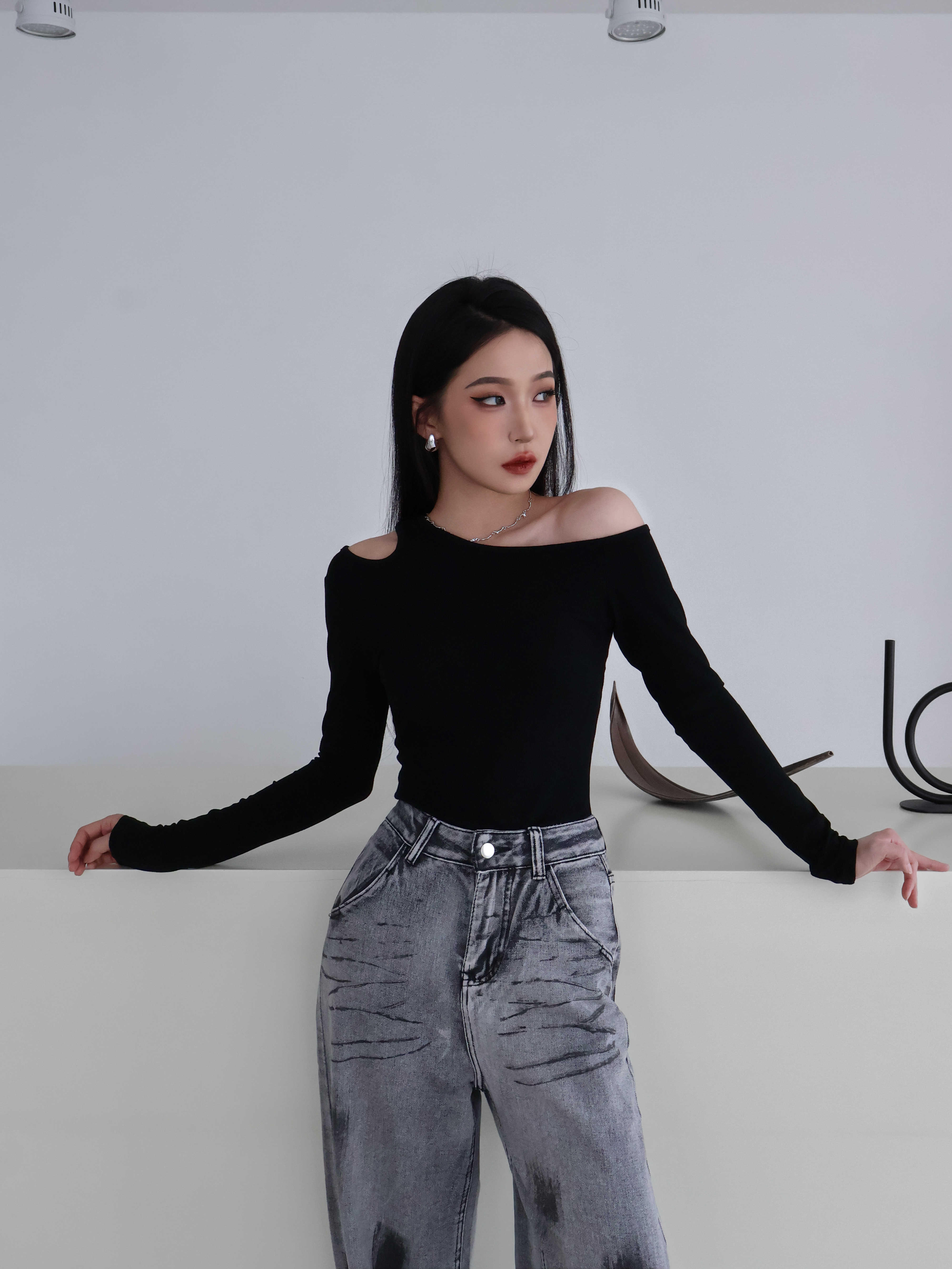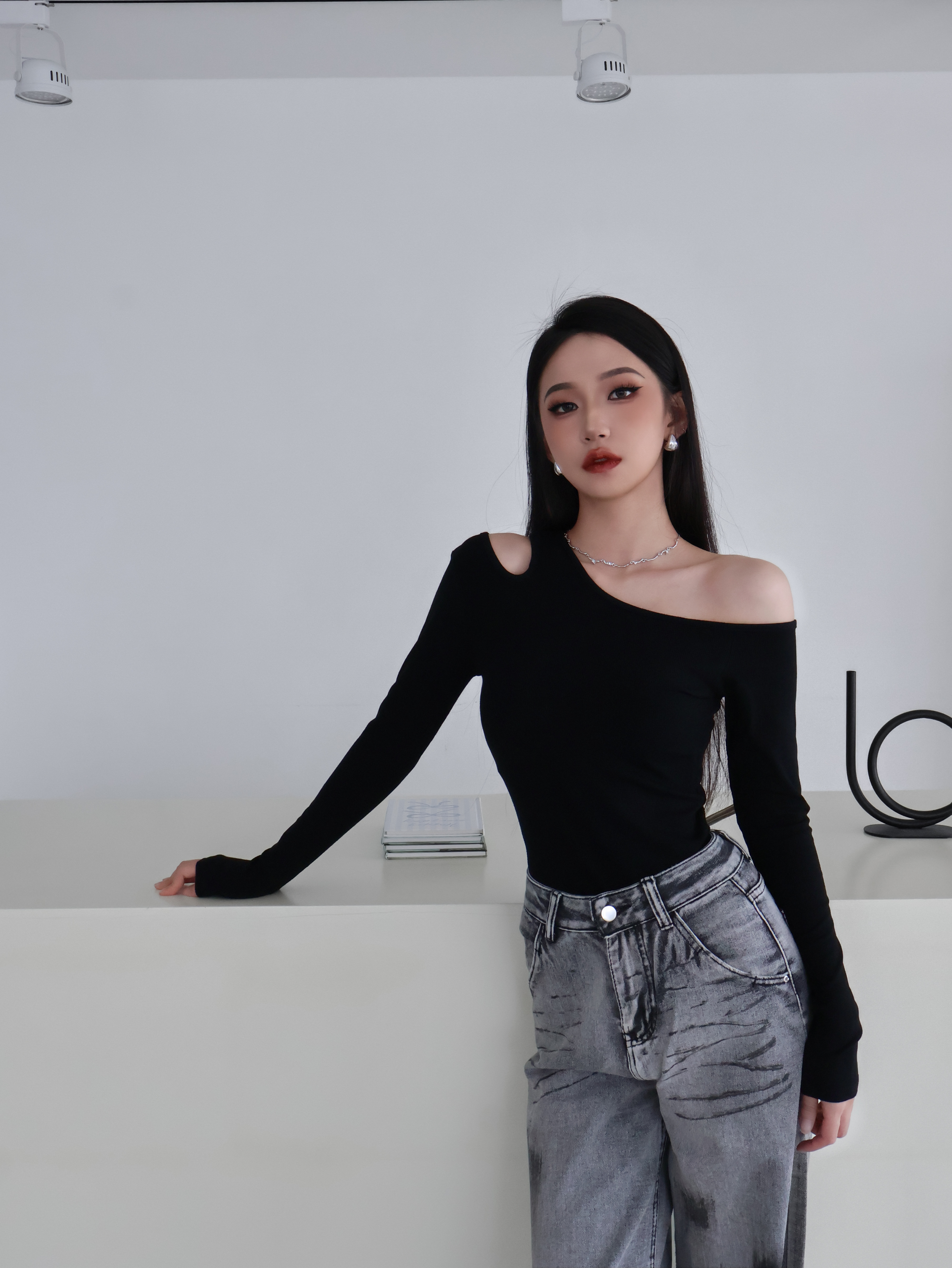 斜肩長袖上衣